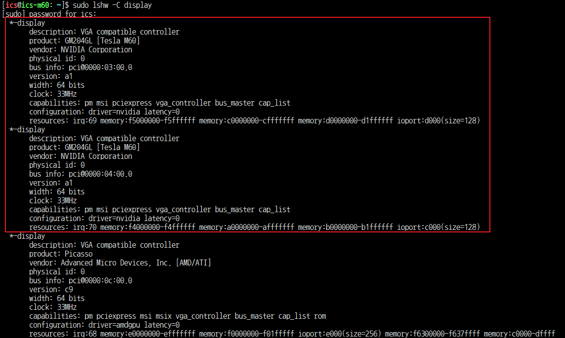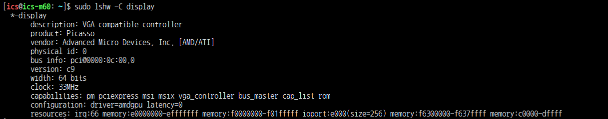 $ sudo lshw -C display 명령어로 우분투에서 사용할 수 있는 hardware list를 보여준다.