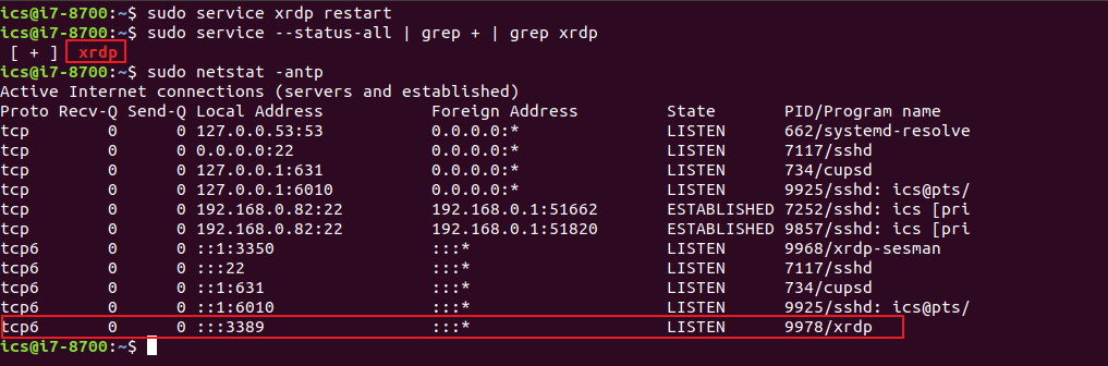 netstat -antp로 listen port를 보았을 때, xrdp에 3389 port가 열려있어야 한다.