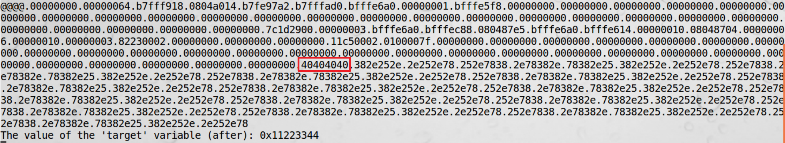 35 printf("The value of the 'target' variable (after): 0x%.8x\n", target);
