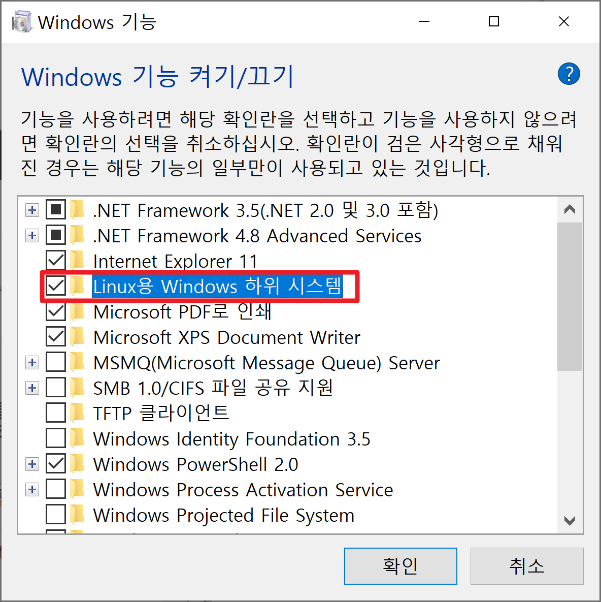 이후 "Linux용 Windows 하위 시스템" 체크박스를 클릭하여 활성화 한다. [그림 2] 참고