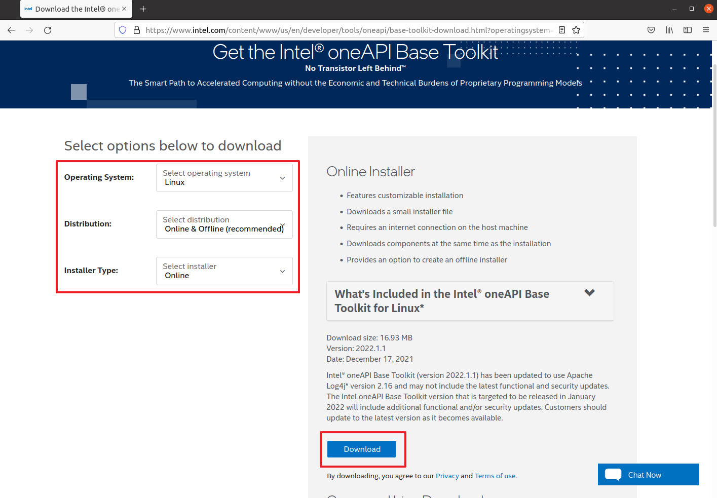 이후 "Download" 버튼을 클릭하면 "~/Download" 경로에 "L_BaseKit_p_2022.1.1.119.sh" 파일이 존재한다.