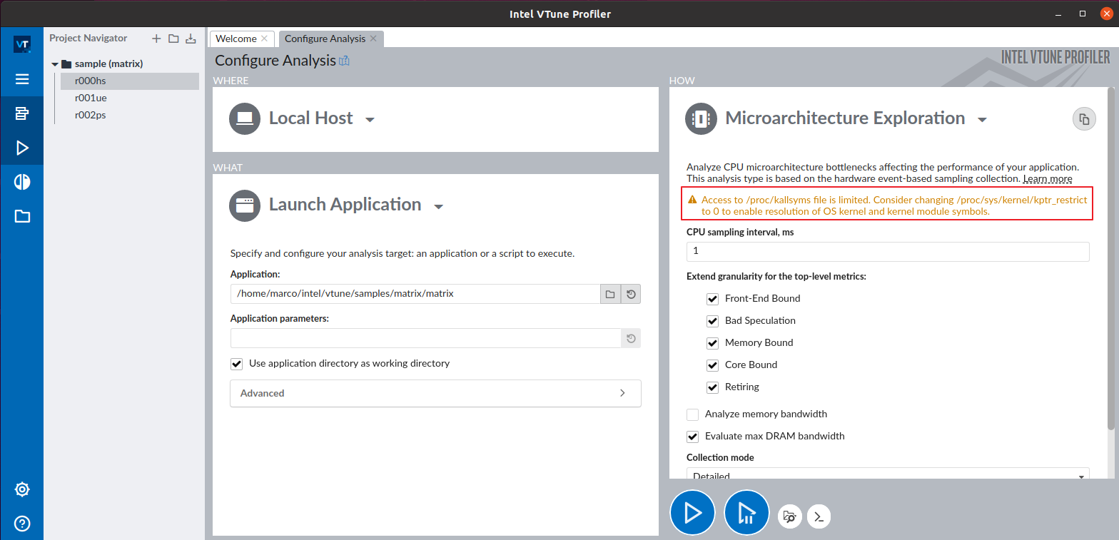 이후, 간단한 sample 바이너리 실행을 위해 다음과 같은 command로 vtune를 실행시킬 수 있다.