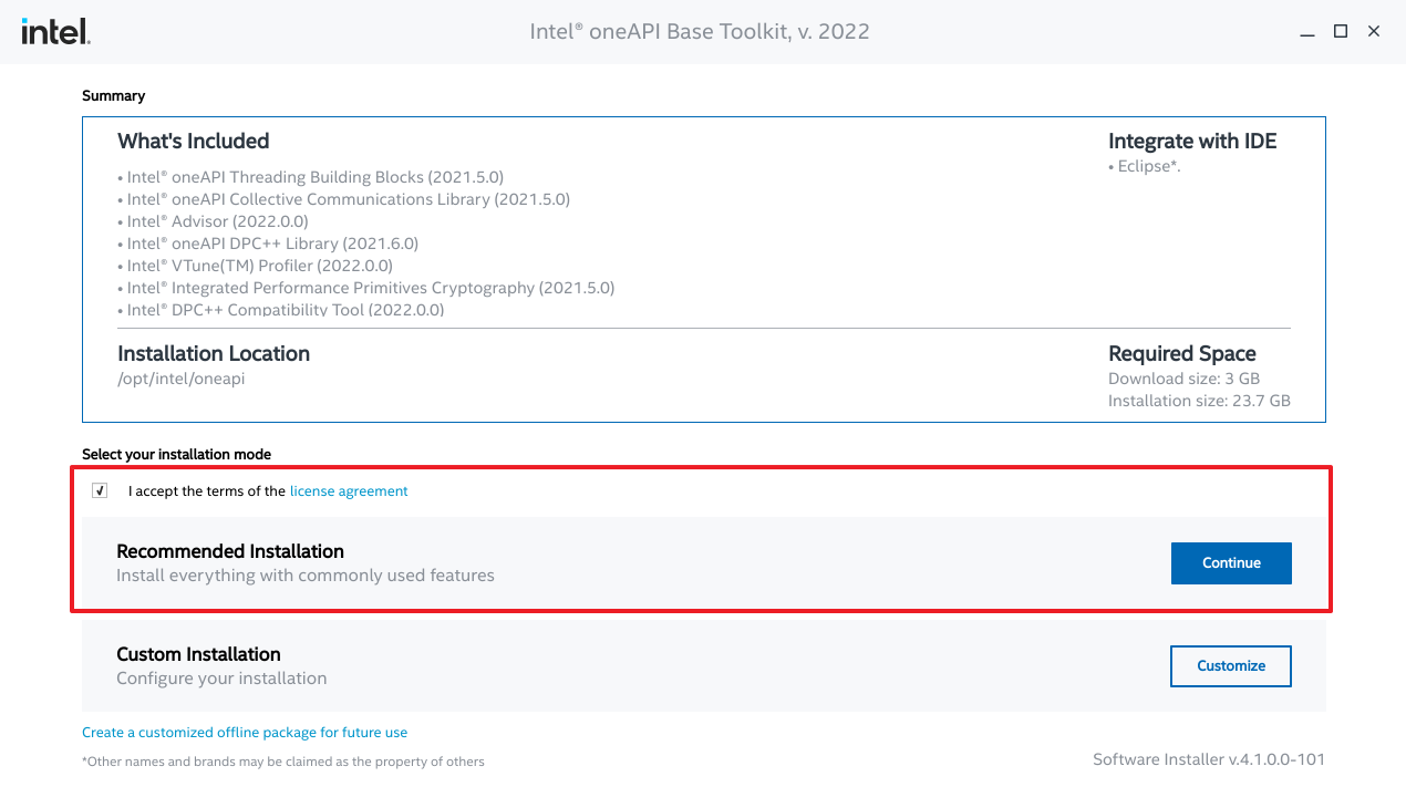 이후, 아래와 같은 화면 ("Intel oneAPI Base Toolkit")을 만났다면 설치가 100% 완료될 때까지 기다리자.