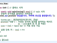 Ex01 // 주석 : 한 줄 주석 /* * 주 석 : 두 줄 이상 주석 * 작성자 : 김태훈 * 작성일 : 2017.02.20 * 내 용 : Java 기초 */ Ex02 콘솔창에 이름, 연락처, 이메일을 출력하세요. ※ 프로그래밍 오류 Java를 시작하면서 오류가 날수 있는 경우가 크게 3가지가 있다. 만일 오류가 난다면 다음중 3가지중 하나일 경우가 크니 확인해 보도록 하자. 1. 컴파일 오류 (Compile Error) - 타이핑 오류, 예약어의 잘못 사용, 닫는 괄호의 생략, 구문 종료 기호(;) 빠짐 , 구문 구조 오류등으로 발생 - 자바 컴파일러가 오류의 원인을 찾아 알려줌으로써 쉽게 수정이 가능하다. 2. 런타임(Runtime Error) - 프로그램 실행 시 발생하는 오류. - 프로그램의 ..